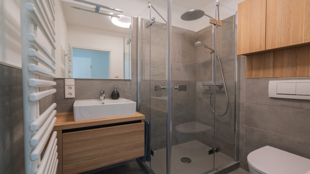 - Bad: Dusche (vollverglast), Waschbecken, WC